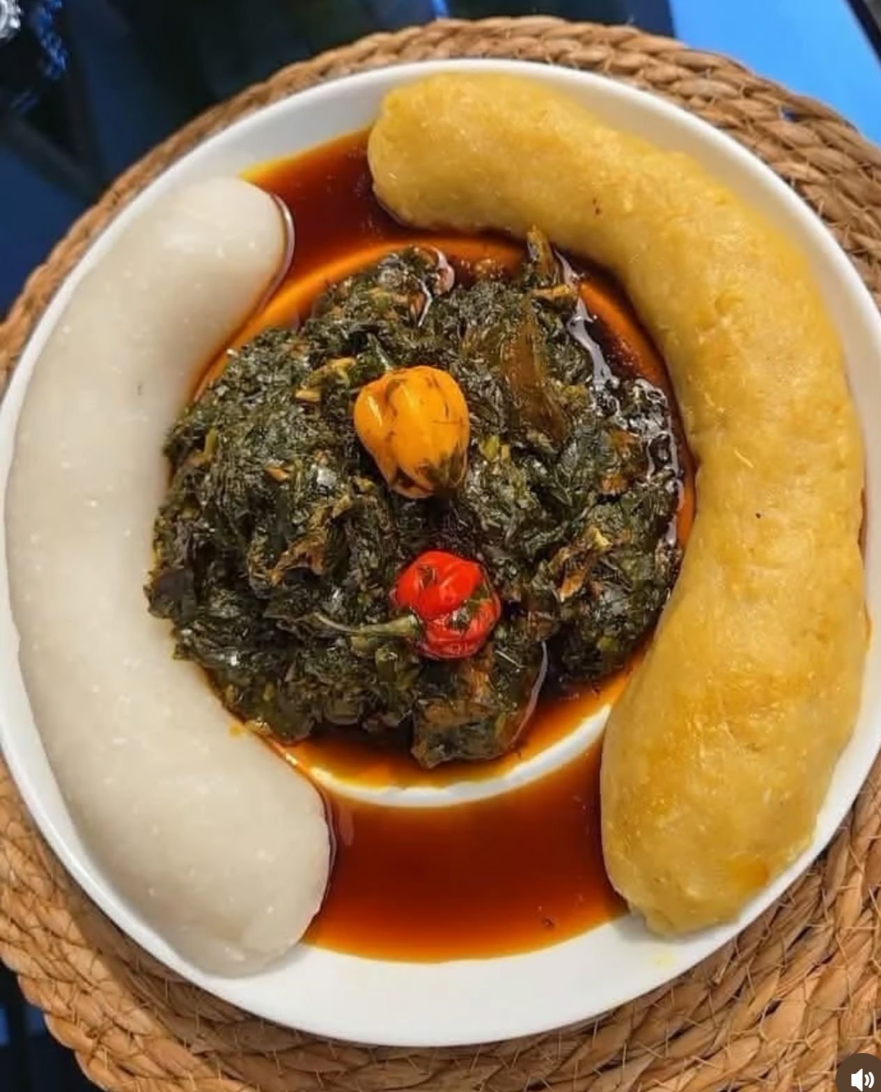 Made with finely shredded leaves, waterleaf or spinach, crayfish, beef, cow skin (kpomo), and traditional Cameroonian seasoning, this meal is rich in taste and heritage. Paired with soft, stretchy fufu, it’s the kind of food that fills your stomach and your soul.